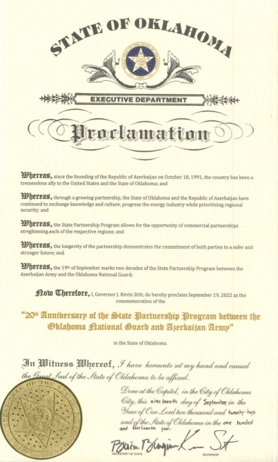 ABŞ-ın Oklahoma ştatının qubernatoru Kevin Skitt Oklahomanın Milli Qvardiyası ilə Azərbaycan Ordusu arasında Dövlət Tərəfdaşlığı Proqramının 20 illiyi münasibətilə bəyannamə imzalayıb.