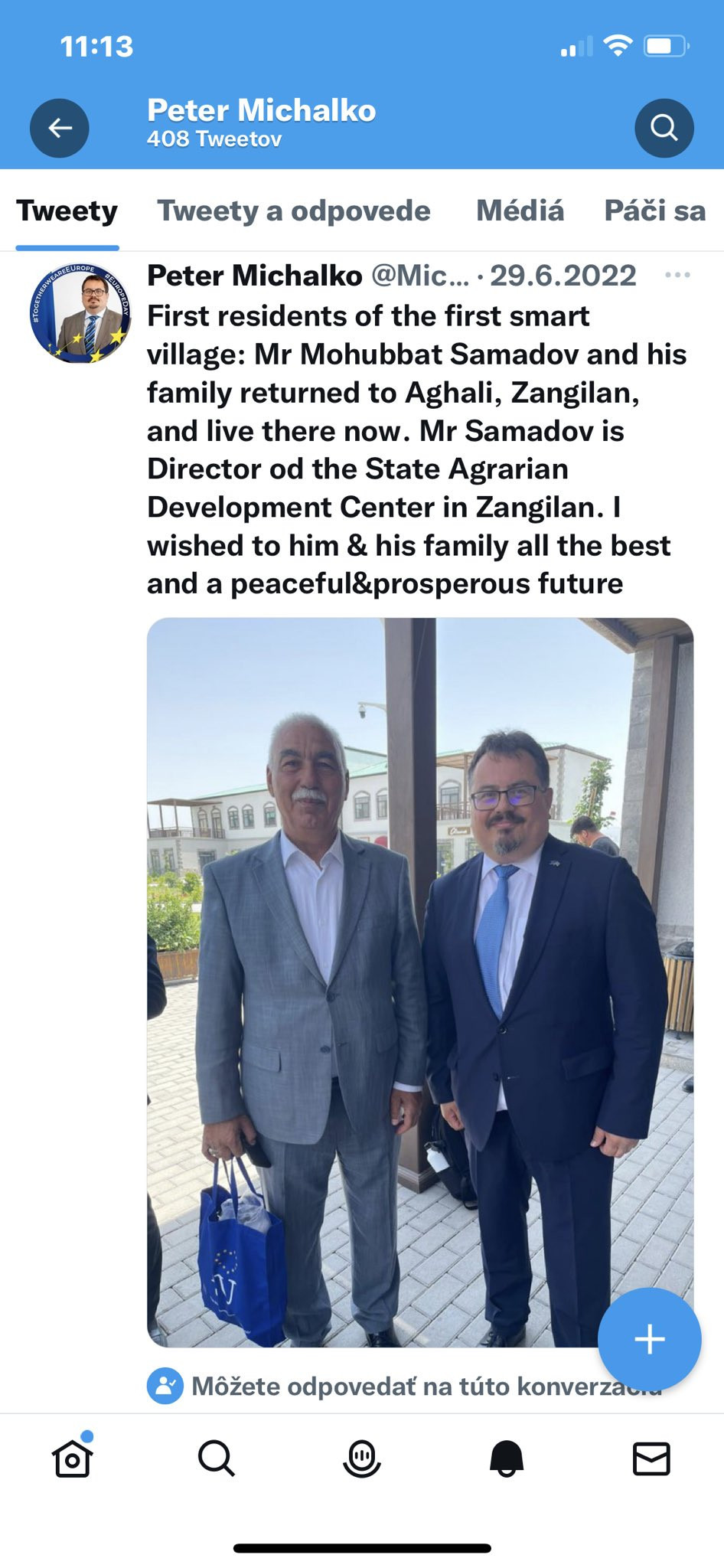 "6 aydan sonra Ağalıda. Təsirli inkişaf! Burada yaşayan bir dostla, Möhübbət Səmədovla tanış oldum, ailəsi ilə birlikdə buraya ilk qayıdan ailə kimi xoşbəxt həyat qurub. Cənab Səmədova və ailəsinə xoşbəxtlik və firavanlıq arzulayıram!”.