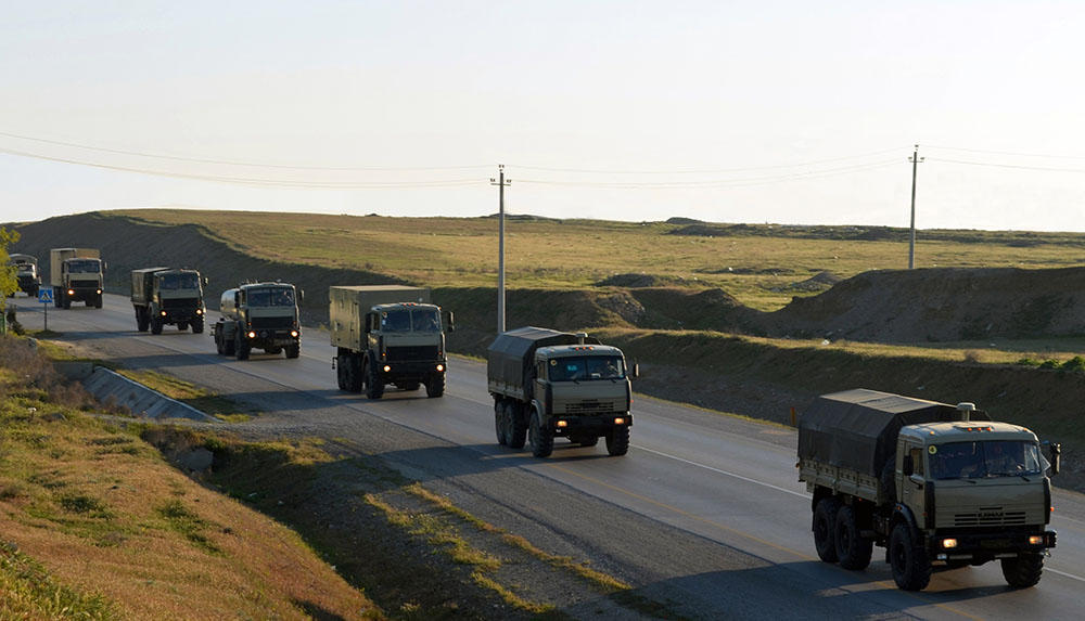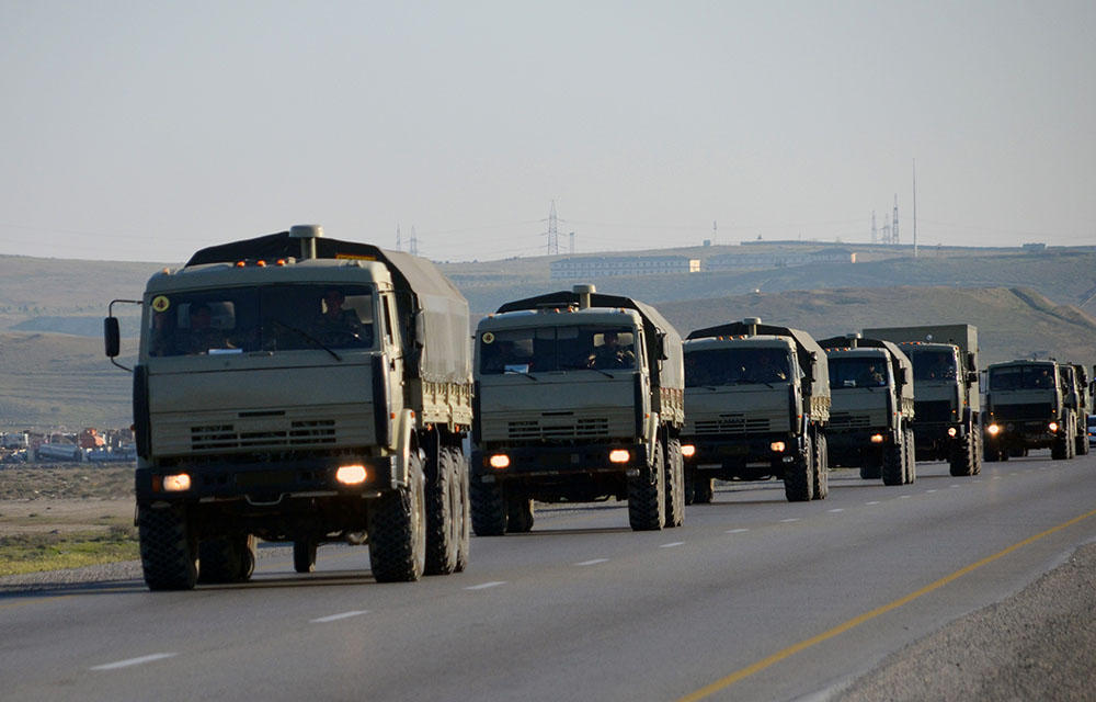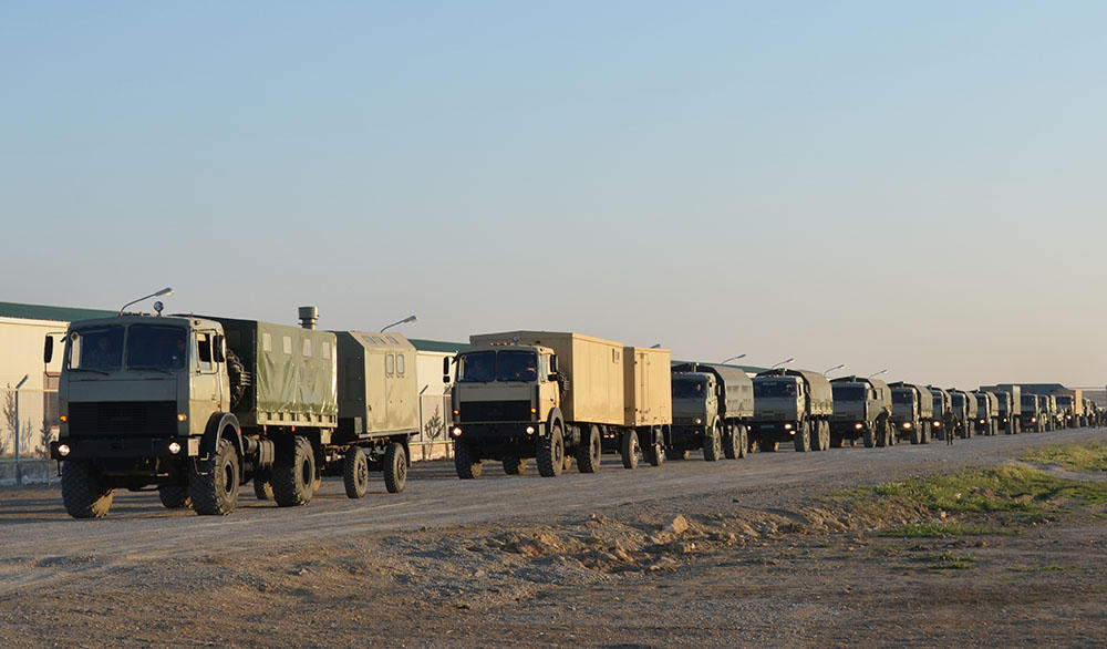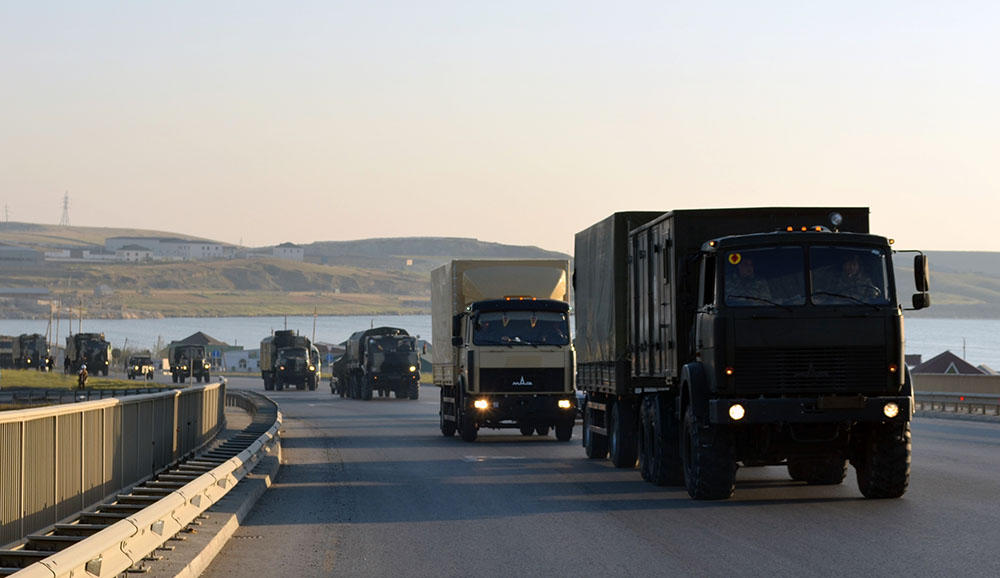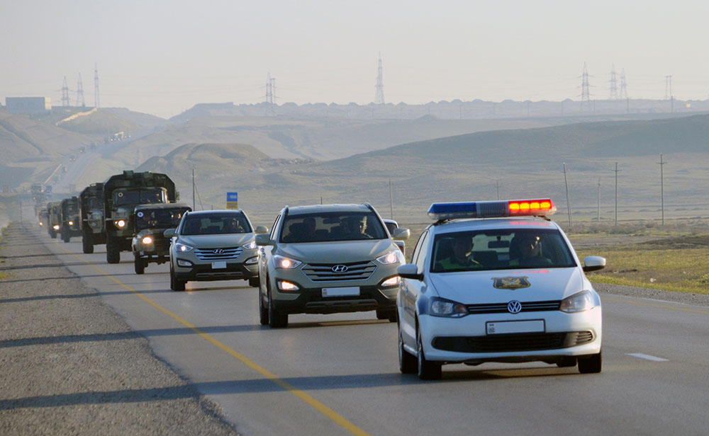 Genişmiqyaslı təlimlərin keçirilməsi planına uyğun həyəcan siqnalı ilə qaldırılan qoşunlar və komanda idarəetmə məntəqələri əməliyyat təyinatı rayonları istiqamətində hərəkət edirlər.