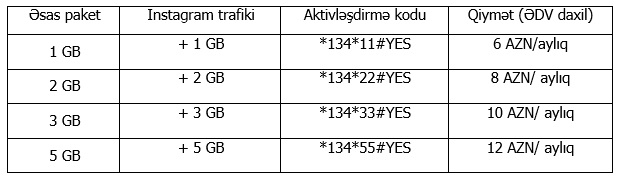 Yeni Instagram paketlərinə internetdə istənilən məqsədlər üçün istifadə olunan əsas trafik həcmi (MB) və xüsusi bonus – Instagram istifadəsi üçün pulsuz trafik daxildir. "Instagram”dan pulsuz istifadə üçün verilən trafik həcmi (MB) əsas internet həcminə bərabər olacaq və abunəçilərə əsas trafikdən istifadə etmədən müxtəlif şəkil və videolar yükləməyə və xəbər lentini nəzərdən keçirməyə imkan verəcək.
