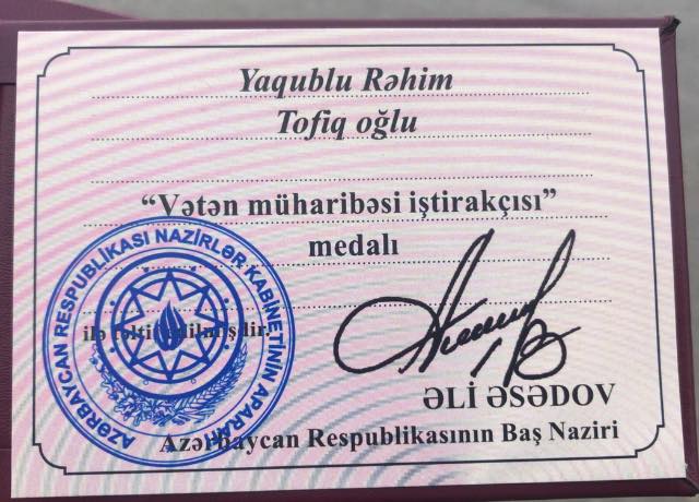 Hazırda inzibati həbsdə olan tanınmış müxalif lider Tofiq Yaqublunun oğlu Rəhim Yaqublu 2-ci Qarabağ müharibəsindəki iştirakına görə "Vətən müharibəsi iştirakçısı” medalı ilə təltif olunub.