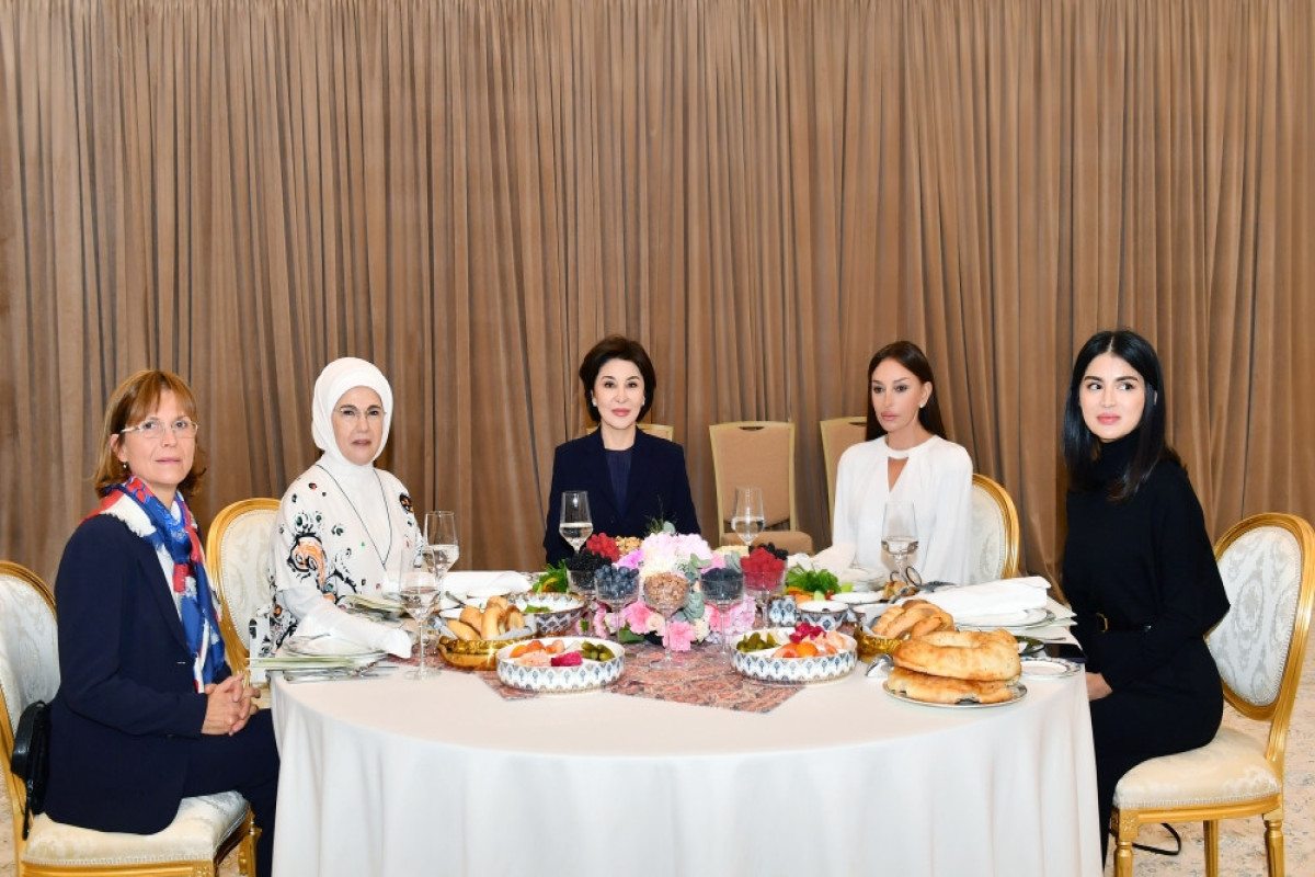 Aktual.az xəbər verir ki, noyabrın 11-də Türk Dövlətləri Təşkilatının IX Zirvə Görüşü çərçivəsində Azərbaycan Respublikasının birinci xanımı Mehriban Əliyeva, Özbəkistan Respublikasının birinci xanımı Ziroatxon Mirziyoyeva, Türkiyə Respublikasının birinci xanımı Əminə Ərdoğan və Macarıstan Respublikasının Baş nazirinin xanımı Aniko Levai Səmərqənddə təşkil olunan naharda iştirak ediblər.