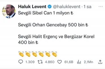 Levent son mesajlarının birində Bergüzar Korel və Halit Ergenç cütlüyünün də zəlzələ qurbanları üçün 400 min TL bağışladığını açıqlayıb.