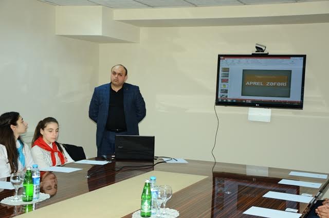 Daha sonra 54 saylı məktəbin tarix müəllimi Zeynal Qasımovun təqdimatında Aprel döyüşləri dərsinə başlanıldı. Z.Qasımov hazırladığı slaytla Qarabağ müharibəsi və 2016-cı ilin aprel ayının 1-dən 2-nə keçən gecədən başlayaraq Azərbaycan və Ermənistan silahlı qüvvələri arasında baş vermiş dördgünlük müharibə zamanı Füzuli rayonu istiqamətində yerləşən "Lələ təpə” adlandırılan yüksəkliyin azad edilməsindən, Azərbaycan bayrağının Lələ təpədə dalğalandırılmasından, bu yüksəkliyin azad edilməsinin strateji əhəmiyyəti barədə məktəblilərə məlumat verdi.