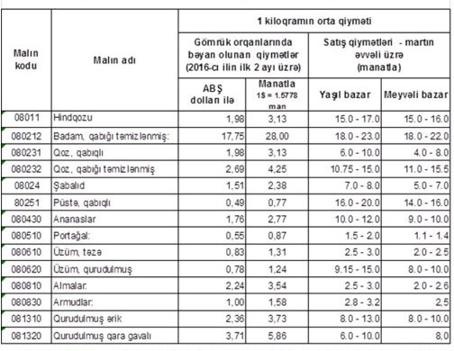 Novruz bayramı ilə əlaqədar DGK tərəfindən bu yaxınlarda araşdırma aparılıb və quru meyvələrin sahibkarlar tərəfindən bəyan edilən gömrük dəyəri və faktiki bazar qiymətləri arasında müqayisəli təhlil aparılıb. Sonuncu aparılan araşdırmaları üzrə qiymətlər aşağıdakı cədvəldə verilib: