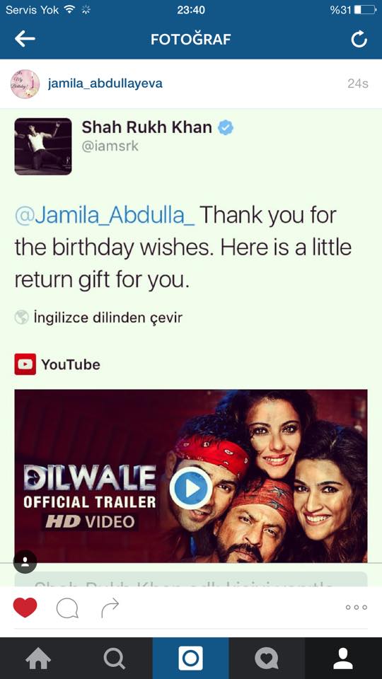 Aktual.az Ölkə.Az-a istinadən xəbər verir ki, məşhur Bollivud aktyoru Şahrux Xan azərbaycanlı tələbə qıza sürpriz edərək onu doğum günü münasibətilə təbrik edib.