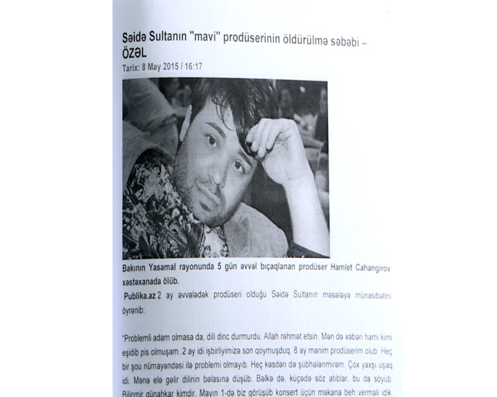 Zərərçəkmiş Solmaz Həsənova qırılmış vəziyyətdə olan telefonu tanıyıb və onun nəvəsi Hamletə məxsus olmasını təsdiq edib. Qadın bildirib ki, mərhum prodüsser kimi bir sıra müğənnilərlə, sonuncu dəfə Səidə Sultanla işləyib.