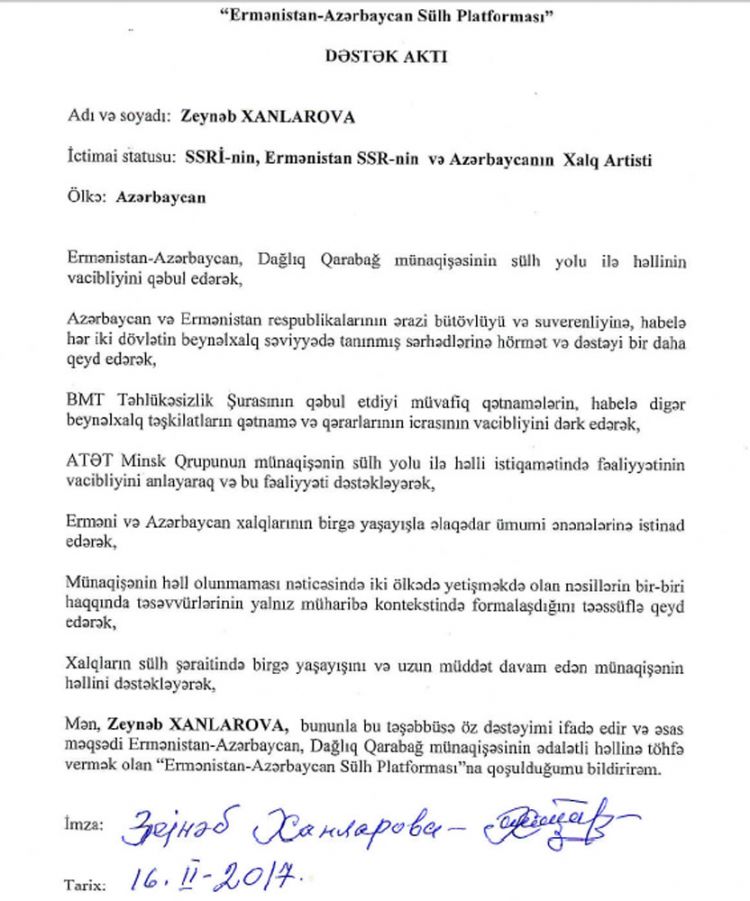 "BMT Təhlükəsizlik Şurasının qəbul etdiyi müvafiq qətnamələrin, habelə digər beynəlxalq təşkilatların qətnamə və qərarlarının icrasının vacibliyini dərk edərək, ATƏT Minsk Qrupunun münaqişənin sülh yolu ilə həlli istiqamətində fəaliyyətinin vacibliyini anlayaraq və bu fəaliyyəti dəstəkləyərək, erməni və Azərbaycan xalqlarının birgə yaşayışla əlaqədar ümumi ənənələrinə istinad edərək, münaqişənin həll olunmaması nəticəsində iki ölkədə yetişməkdə olan nəsillərin bir-biri haqqında təsəvvürlərinin yalnız müharibə kontekstində formalaşdığını təəssüflə qeyd edərək, xalqların sülh şəraitində birgə yaşayışını və uzun müddət davam edən münaqişənin həllini dəstəkləyərək, mən, Zeynəb Xanlarova bu təşəbbüsə dəstəyimi ifadə edir və əsas məqsədi Ermənistan-Azərbaycan, Dağlıq Qarabağ münaqişəsinin ədalətli həllinə töhfə vermək olan Ermənistan-Azərbaycan Sülh Platformasına qoşulduğumu bildirirəm”.