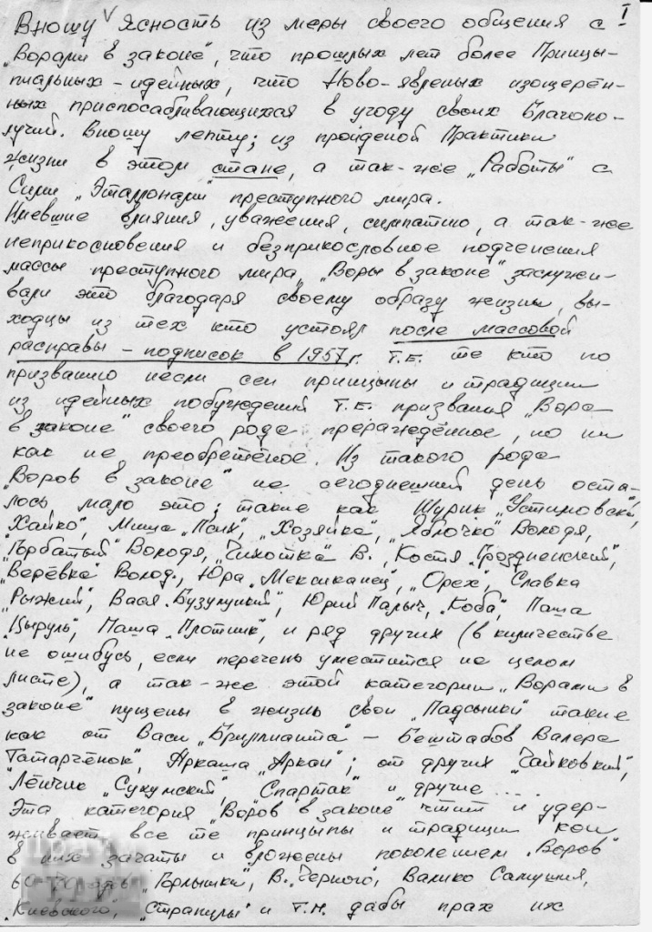 "Bütün cinayətləri oğruların üzərinə atmayın. Biz öz üzərimizdə oğrunun şərəfli xaçını gəzdiririk. O, sizin hakimiyyət tövlənizdən qat-qat təmizdir. Bu gün bizi qurban verirsiniz, sabah biz olmayanda sizin boğanızdan yapışacaqlar. Qardaşlar başa düşməlidirlər ki, bizi dağıtmaq istəyirlər. Bu külək haradan əsir? Deyəsən, Qərbdən. Görünür bizim birliyimizdən qorxub, bizi məhv eləmək istəyirlər. Onlar birinci zonalar hücum etdilər, sonra isə kordona keçdilər. Orada onlara Rusiyada qardaşlığın gücünün nə olduğunu göstərdilər. Yada düşdü? Mən Vladimir sentralında Bukovski ilə görüşmüşəm. O, cinayətkarların mürtədləri (hakim dindən ayrılmış şəxs) dəstəkləmək üçün "qardaşları” siyasətə cəlb etmək istəyirdi. Bizim sahibimiz yoxdur, amma onların hamısının sahibi Qərbdədir. Bizim tutuğumuz mövqe onların xoşuna gəlmədi. İndi Rusiya kimi, cinayət dünyası da sümük kimi boğazlarında ilişib qalıb”.